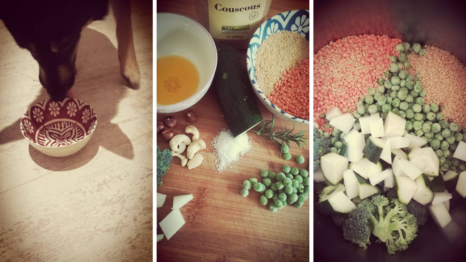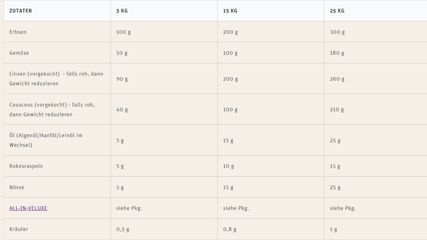 È possibile ridurre in purea, grattugiare o tritare grossolanamente le verdure crude. Più sono lavorate finemente, più le vitamine sono disponibili per la digestione. In generale, comunque, tutte le ricette soddisfano i requisiti se si somministrano le verdure in pezzi grossolani. In questo modo si crea una maggiore pienezza nello stomaco. Questo effetto (a volte anche visivamente psicologico) è particolarmente positivo per i cani che hanno costantemente fame. Inoltre, gli importanti batteri intestinali vengono riforniti di cibo grazie all'aumento del contenuto di fibre.