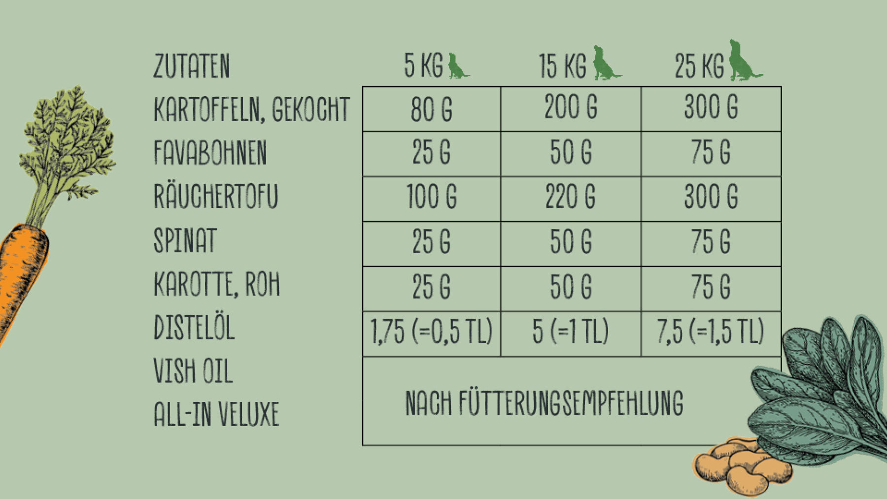 Per le quantità dei singoli ingredienti, consultare questa tabella, che dipende dal peso del cane: