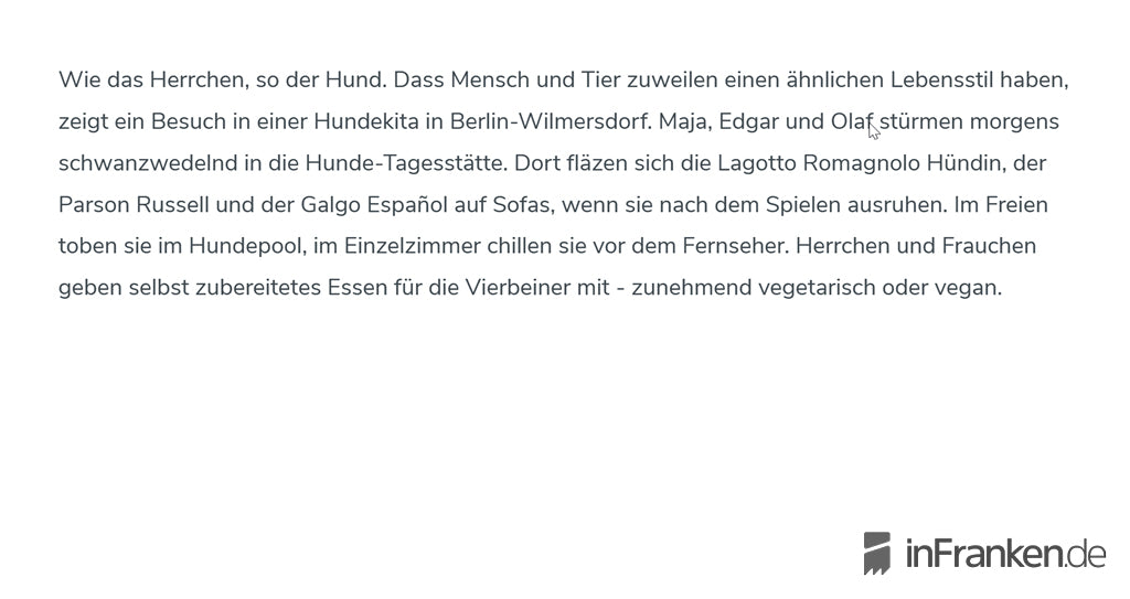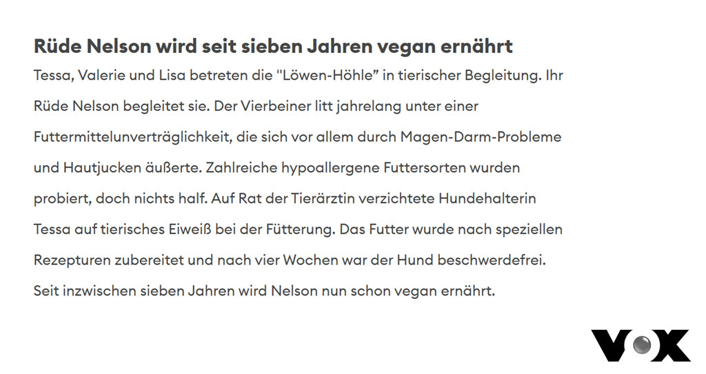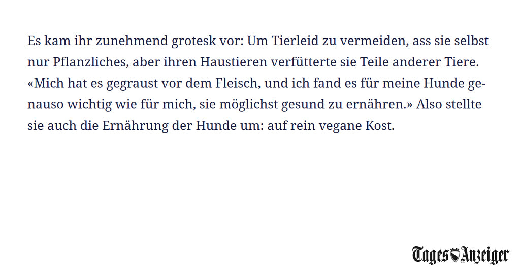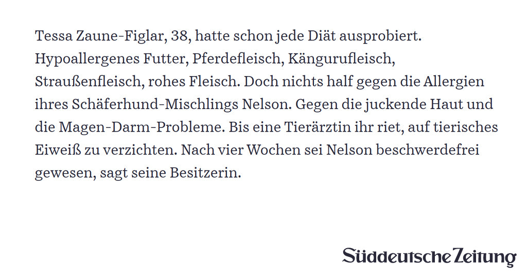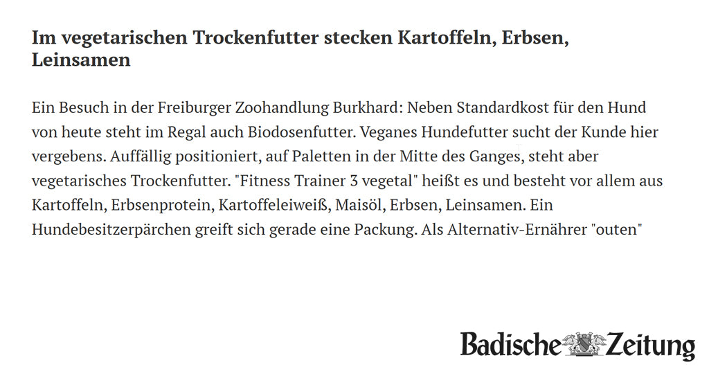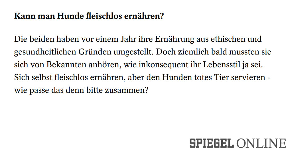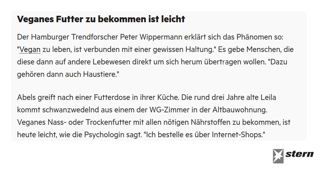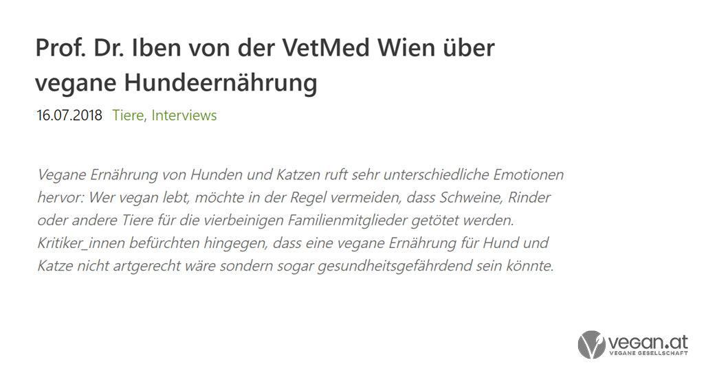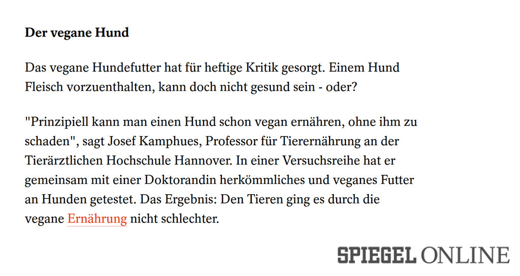 Hier findet Ihr eine Sammlung aus der Presse zum Thema “veganes Hundefutter” und “VEGDOG”. Aus diversen Presseartikeln wird deutlich, dass eine vegane Hundeernährung grundsätzlich möglich ist. Das Wichtigste dabei ist – wie auch bei allen anderen Fütterungsalternativen – dass eine ausreichende Versorgung mit allen Nährstoffen gewährleistet wird (erfahre mehr in unseren FAQs). Aus diesem Grund arbeiten wir eng mit Fachtierärzten zusammen und lassen regelmäßig Nährstoffanalysen anfertigen, um eine 100% bedarfsdeckende Versorgung zu gewährleisten.Wir möchten sicher stellen, dass es Euren, wie auch unseren Hunden an nichts fehlt.