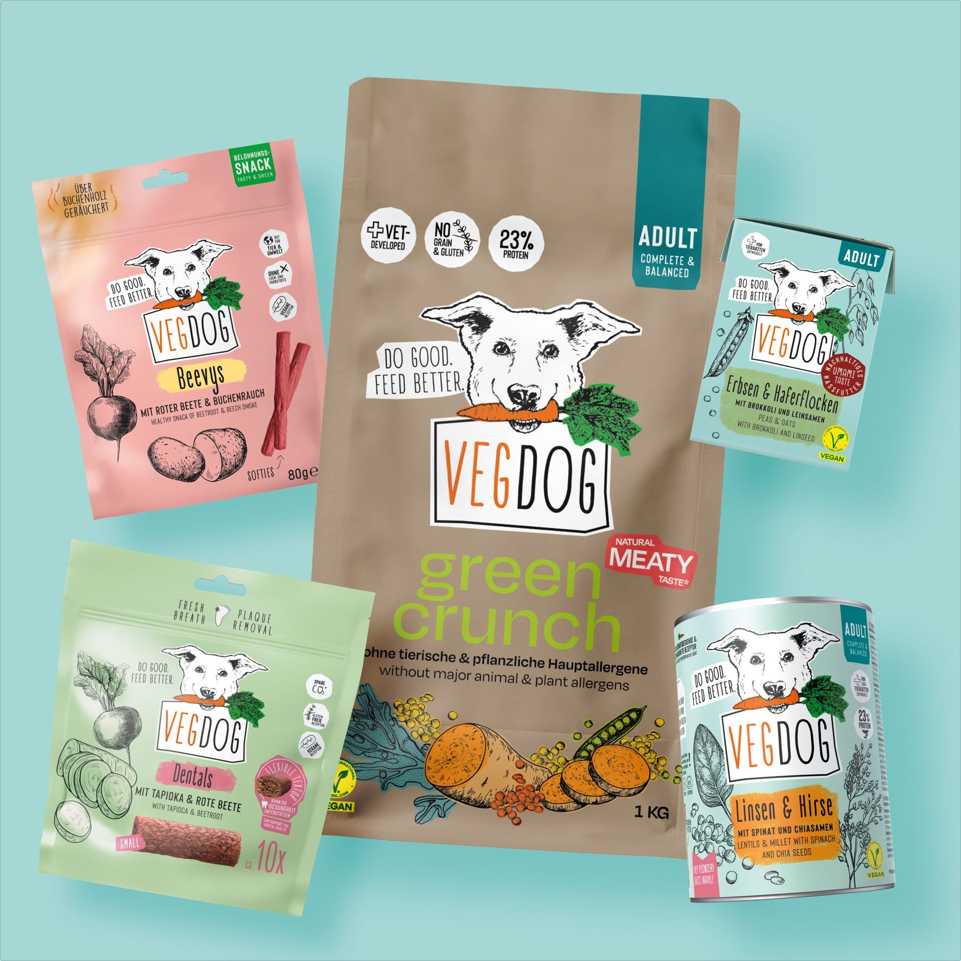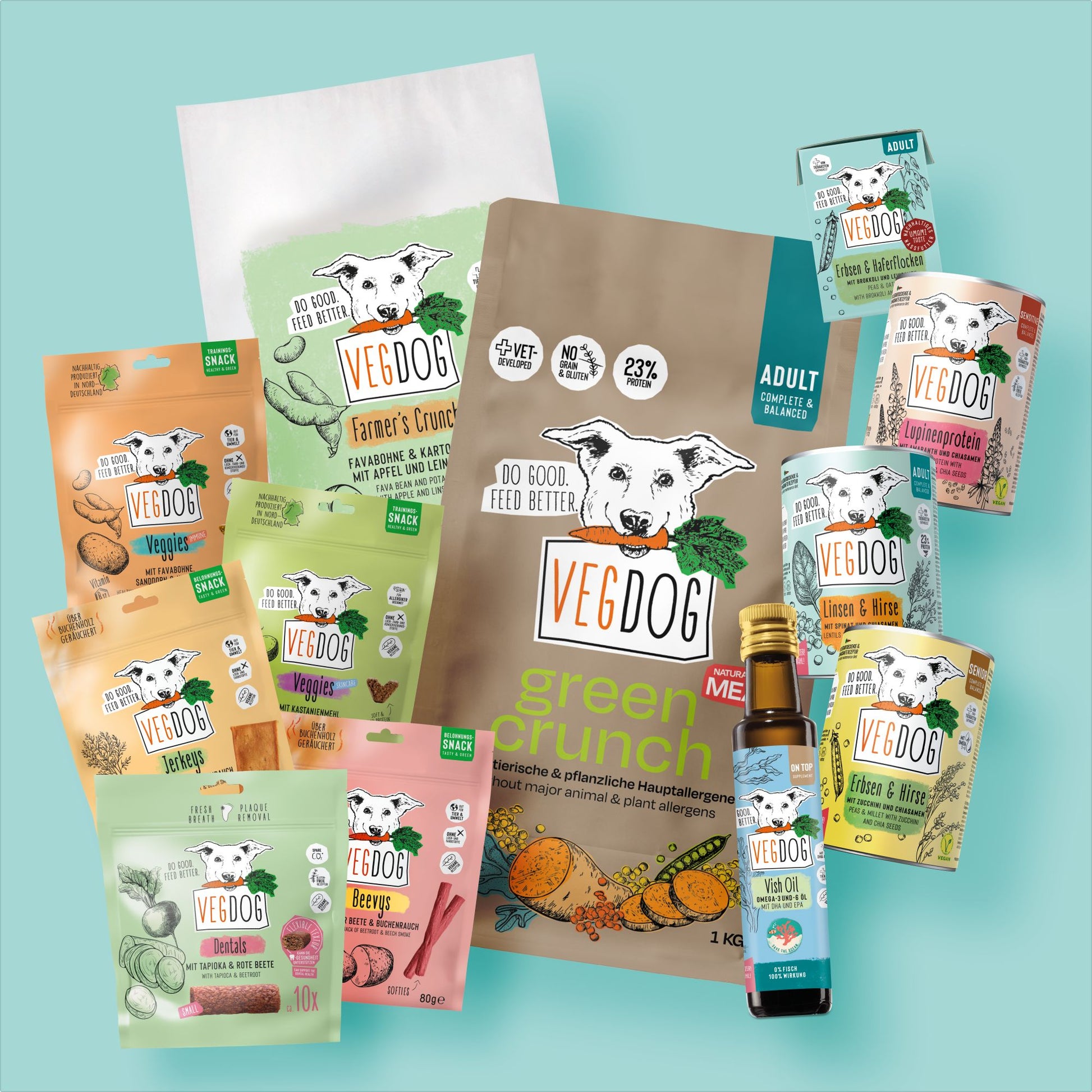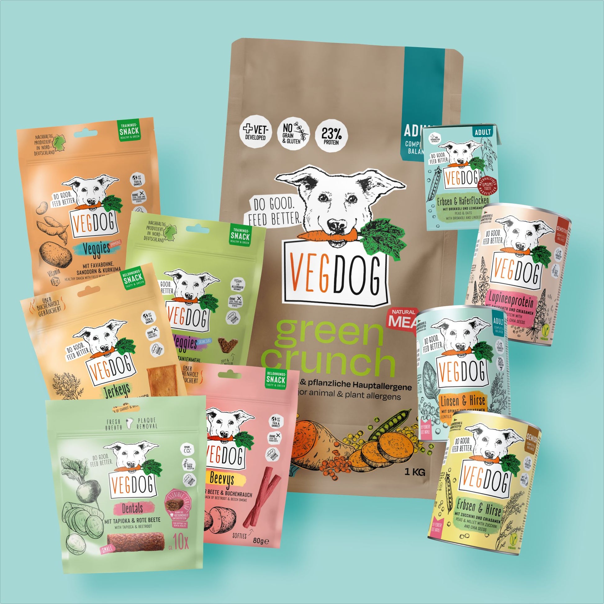 Una volta tutto, per favore! Fate qualcosa di buono e date al vostro cane vegano il cibo migliore. Alimenti secchi e umidi genuini, oltre a croccantini e bocconcini. Con la Pionierbox M risparmiate l'11% rispetto all'acquisto individuale. E con l'abbonamento avrete sempre cibo a sufficienza.