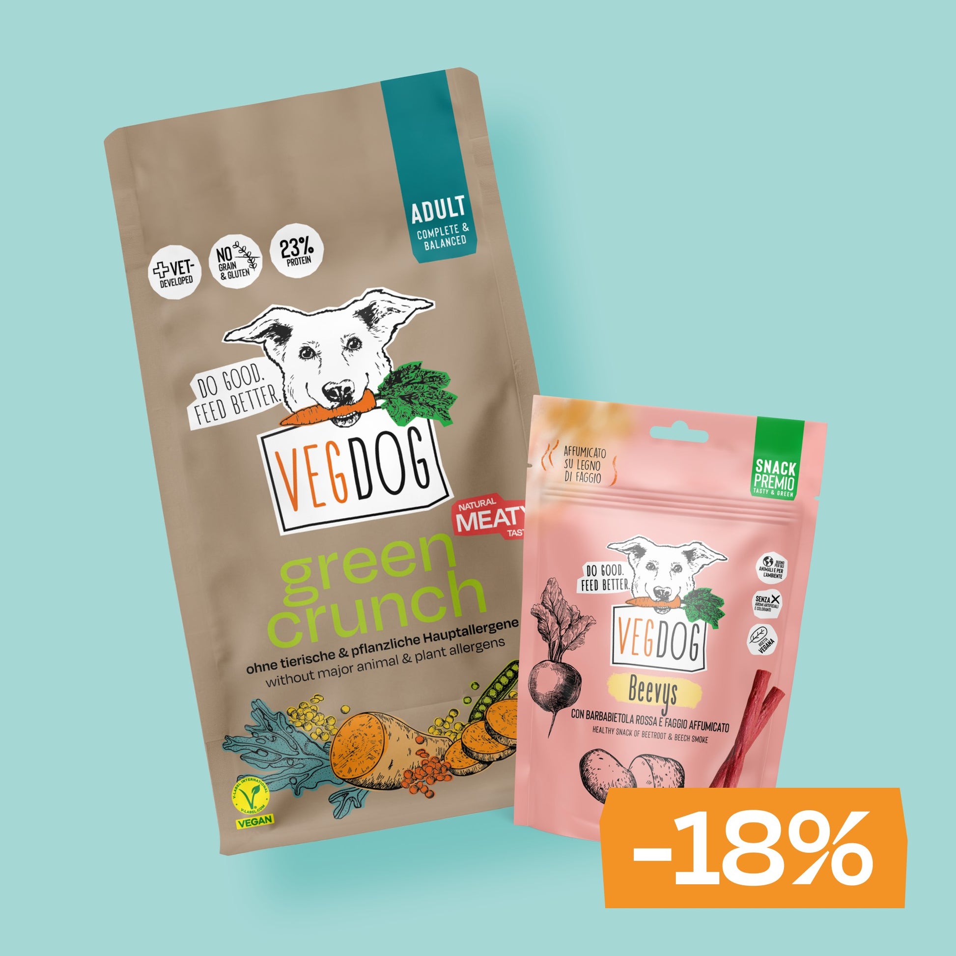 Il nostro Starter Bundle è il pacchetto ideale per chi non solo vuole conoscere i nostri prodotti più popolari, ma anche l'alimentazione vegana del cane! Con
